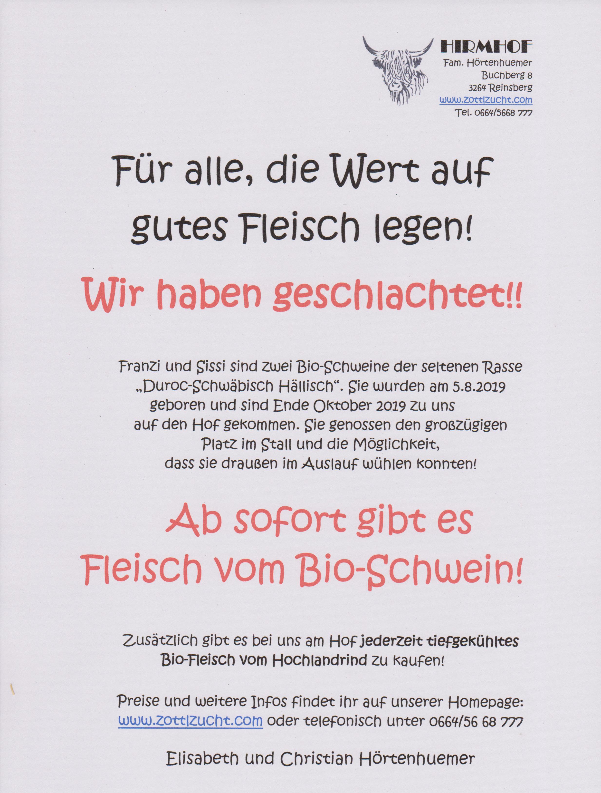 In Kürze gibt es auch verschiedene Würste (Hauswurst, Käsekrainer, Knacker, Frankfurter, Leberkäse), Trockenfleisch, Speck und Geselchtes mit Fleisch von unseren Schweinen und Hochlandrindern!